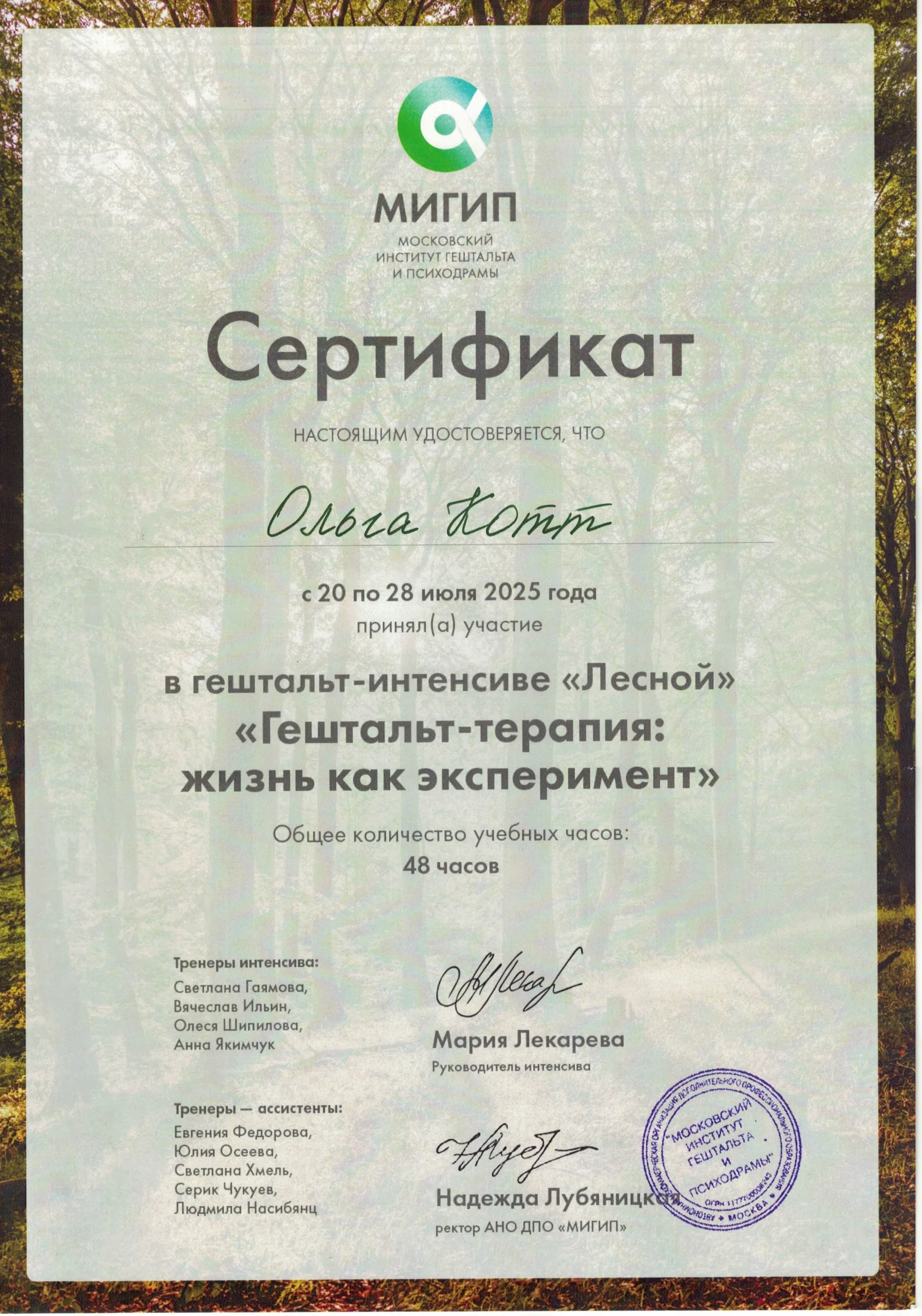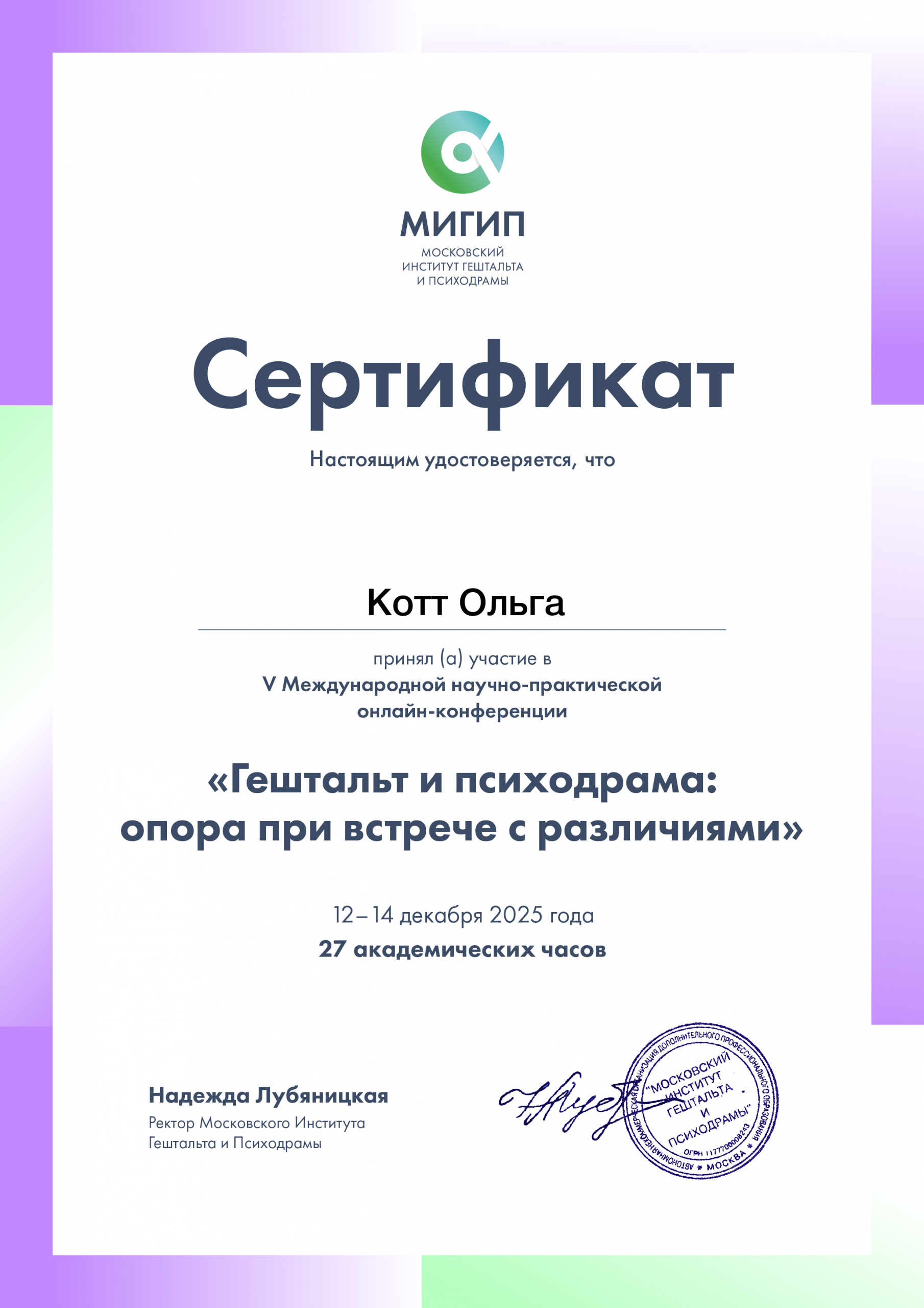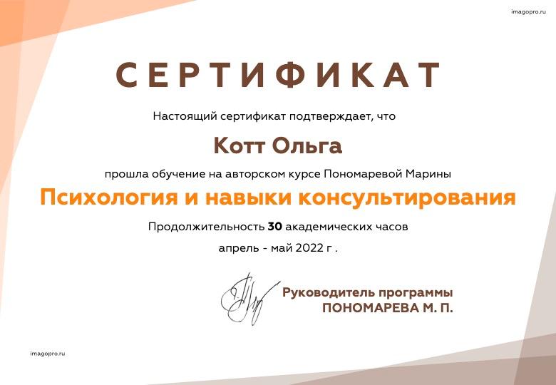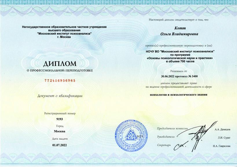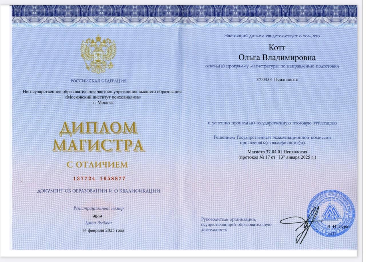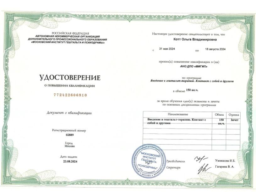 Магистр психологии (МИП). Совершенствую гештальт-подход (МИГИП). Нахожусь в личной терапии . Работаю в соответствии с профессиональными стандартами, включая регулярную супервизию.